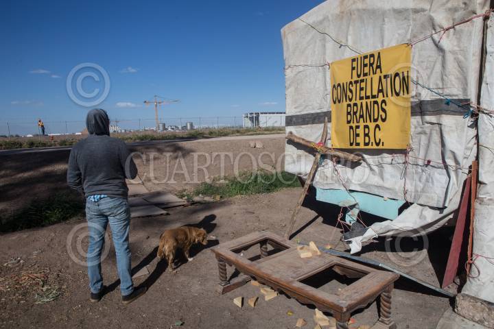 MEXICALI, BAJA CALIFORNIA, 09MARZO2018.-Ambientalistas y ejidatarios de la región miembros de colectivos como Mexicali Resiste, Baja California Resiste y el Comite en Defensa del Agua, han denunciado ante diversos foros nacionales e internaciones que la “construcción con licitaciones irregulares y Constellation Brands, empresa cervecera, en obra en esta ciudad, y que abastecerá al mercado estadounidense” solo traerá más escasez de agua en la región. Explican que la empresa transnacional consumirá 20 millones de metros cúbicos de agua al año para fabricar la cerveza del Grupo Modelo. Esta cantidad es el doble del agua que consume el municipio de Ensenada anualmente, nueve millones, y donde desde hace varios años se raciona el consumo en las colonias populares. Los agricultores de la zona argumentaron que año con año pierden hectáreas de cosechas debido a que ha habido una reducción en el agua que les proveen los distritos de riego, aunado al revestimiento de cemento del canal Todo Americano, ya que anterior a esto, las filtraciones de agua permitían el abastecimiento de barrancos naturales que regaban alrededor de 800 hectáreas. Asimismo, denunciaron que los módulos de riego son sitios donde la corrupción opera y tienen un mercado negro de agua, vendiéndole el agua al ejidatario con mayor capacidad económica, incluso mencionaron que se vende de manera ilegal más agua de la establecida a Tijuana debido a su crecimiento poblacional e industrial. Debido a esto, temen que con la llegada de la cervecera los más afectados sean ellos y sus cultivos. En la imagen, una lona contra la empresa transnacional en un de los campamentos alrededor de la construcción de la planta cervecera. FOTO: TERCERO DÍAZ /CUARTOSCURO.COM