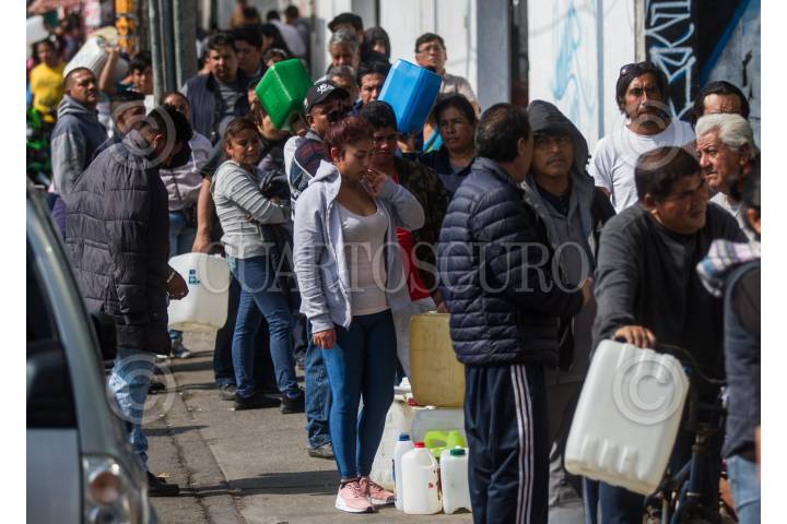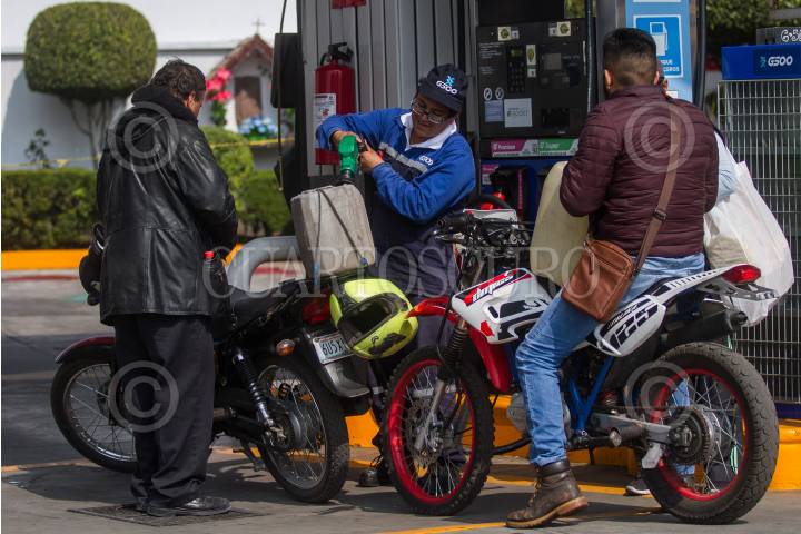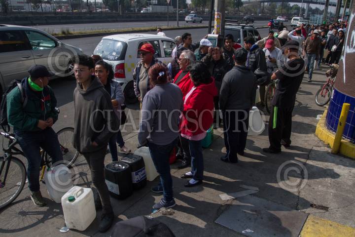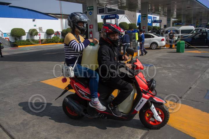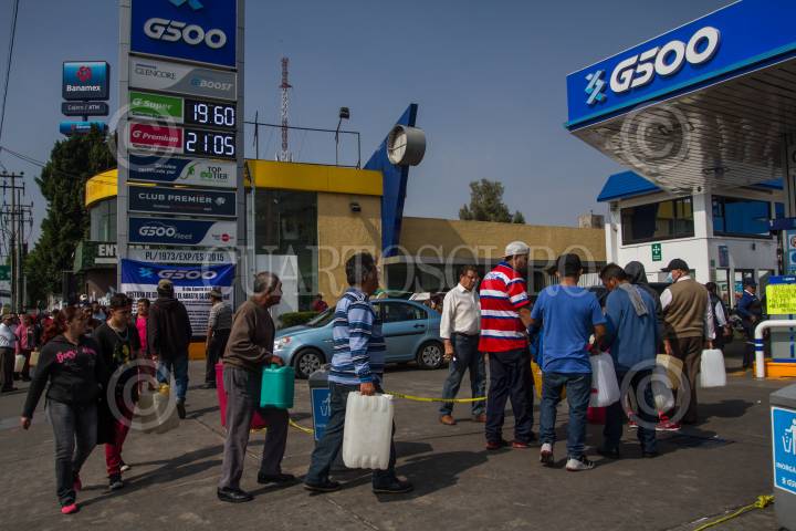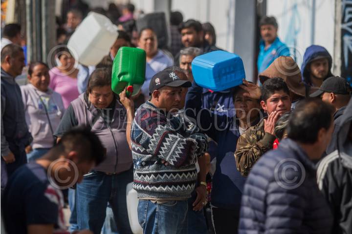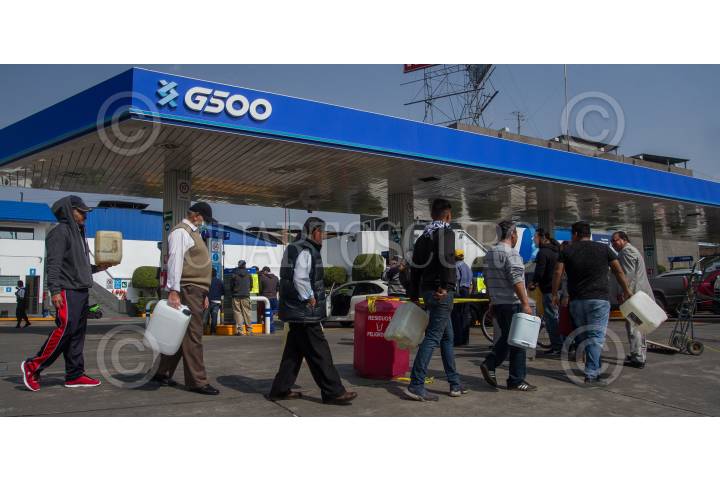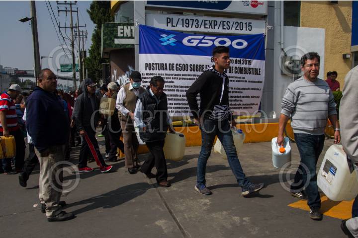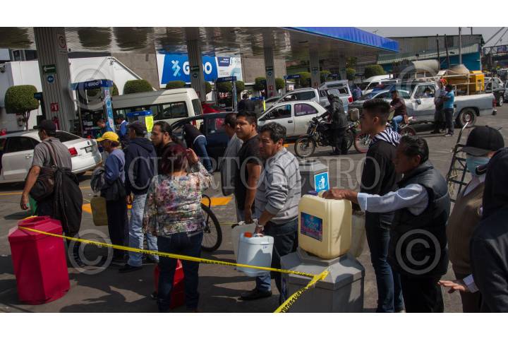 CIUDAD DE MÉXICO, 14ENERO2019.- Continúan las largas filas en algunas gasolineras de la Ciudad de México, en donde la venta del combustible comienza a ser racionada a 20 litros por compra. Sobre avenida Zaragoza, algunos acuden con bidones que son marcados para realizar una compra más ordenada. FOTO: ISAAC ESQUIVEL /CUARTOSCURO.COM