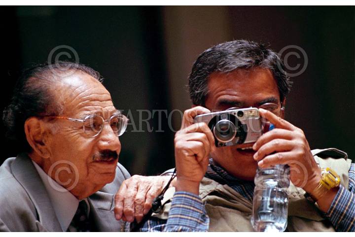 México D.F., 8 de Abril de 2003.- Agustín Pérez Escamilla acompañando a Pedro Valtierra en el ciclo de conferencias en el Club de periodistas. Con 91 años de vida y 70 años como fotógrafo en las primeras horas del día falleció el "Chino Pérez". FOTO: Juan Pablo Zamora/CUARTOSCURO.COM