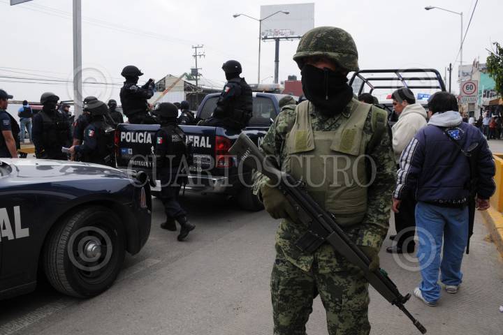 MÉXICO, D.F., 11ENERO2010.- Un oficial de la policía Municipal de Coacalco, perdio la vida durante un enfrentamiento entre presuntos secuestradores y policias. Los cuales al verse rodeados les arrojaron granadas, dejando a un elemento sin vida los hechos ocurrieron frente al restaurante de Mariscos con razón social “Los Delfín I” ubicado en avenida José López Portillo a la altura del Eje 8 en Coacalco. Escapando un delincuente en una de las unidades de los policías Municipales el cual fue alcanzado calles adelante abatiéndolo a tiros en la unidad. Al lugar arribaron elementos del Ejercito Mexicano y para resguardar el lugar en donde fueron detenidos tres presuntos secuestradores y dos camionetas una tipo Urban y una Ford Lobo de reciente modelo. FOTO: LUIS CARBAYO/CUARTOSCURO.COM