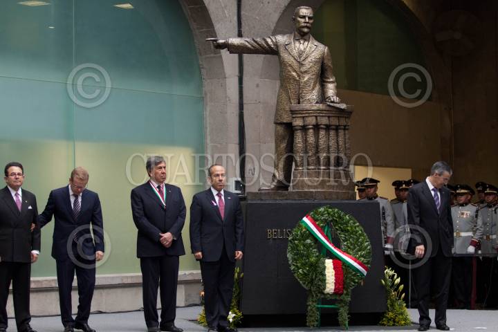 MÉXICO, D.F., 27OCTUBRE2011.- Francisco Arroyo Vieyra, senador, Arturo Escobar y Vega, senador, Cuauhtémoc Cárdenas Solorzano, quien recibió la medalla Belisario Domínguez, Felipe Calderón Hinojosa, Presidente de México, y José González Morfín, presidente del Senado de la República, montaron una guardia de honor en la estatua del senador chiapaneco, luego de finalizar la sesión solemne en la que se condecoró a el Ingeniero. La ceremonia fue realizada en la antigua casona de la calle de Xicoténcatl en el centro histórico. FOTO: MOISÉS PABLO/CUARTOSCURO.COM