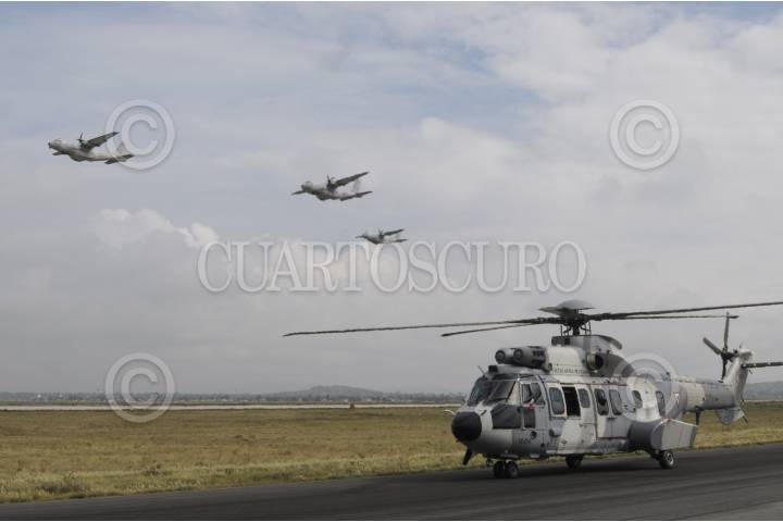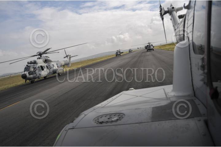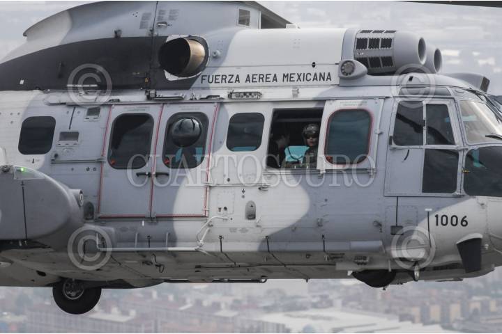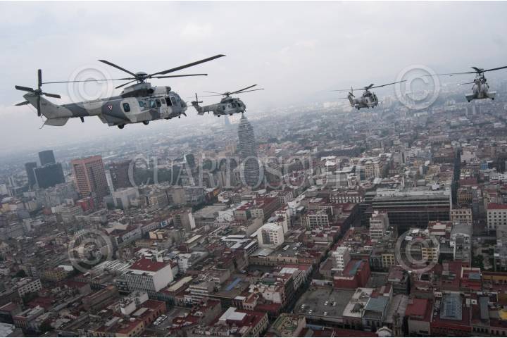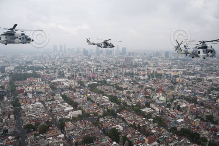 MÉXICO, D.F., 16SEPTIEMBRE2015.- Un escuadrón de helicópteros tipo Cougar participó en el desfile aéreo para conmemorar el 205 aniversario del inicio de Independencia de México, en el que participaron más de 130 aviones y helicópteros para también conmemorar el centenario de la Fuerza Aérea Mexicana. Los escuadrones despegaron de la base aérea de Santa Lucía en Tecamac para volar sobre la mayor parte de la ciudad y arriba del zócalo capitalino. FOTO: DIEGO SIMÓN SÁNCHEZ /CUARTOSCURO.COM