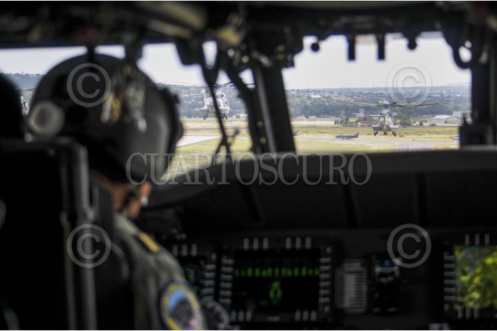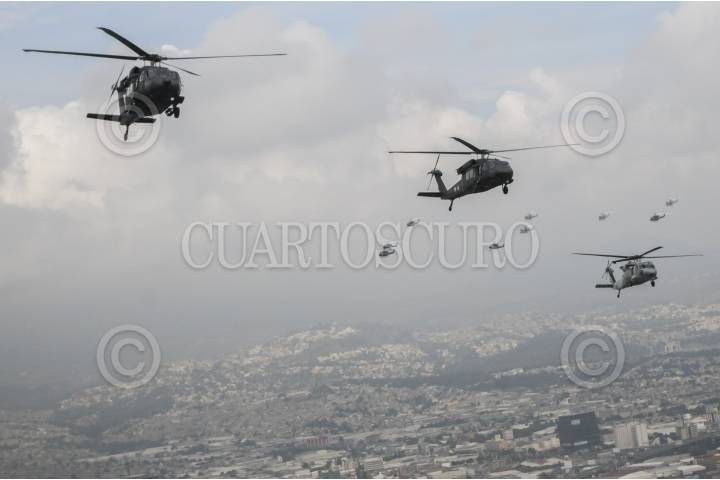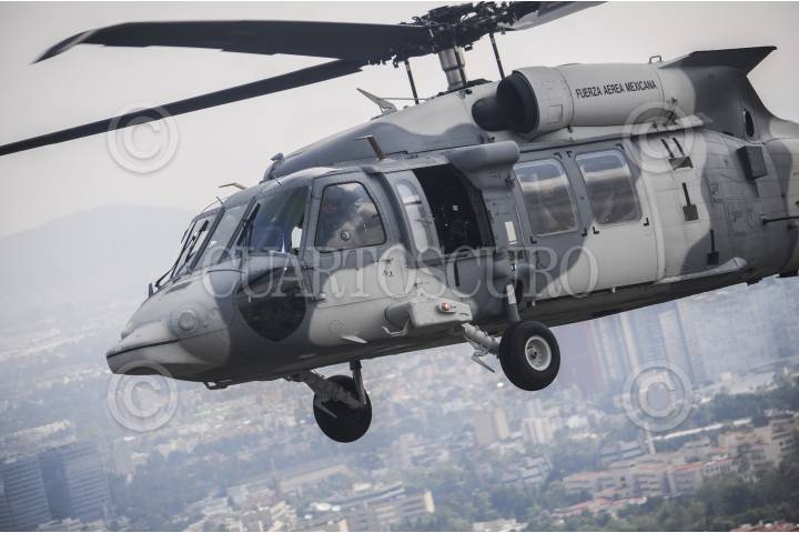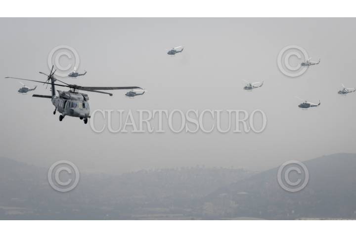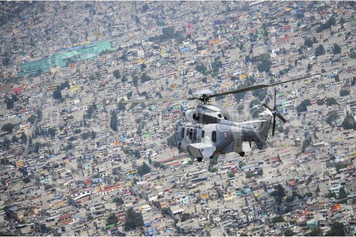 CIUDAD DE MÉXICO, 16SEPTIEMBRE2016.- Escuadrones de helicópteros tipo Cougar y Black Hawk, participaron en el desfile aéreo que organizó la Fuerza Armada de México, como parte de los festejos para conmemorar el inicio de la guerra de independencia de México. Las aeronaves despegaron de la base aérea de Santa Lucía, Tecamac, y se desplazaron por las principales avenidas de la ciudad. FOTO: DIEGO SIMÓN SÁNCHEZ /CUARTOSCURO.COM