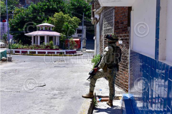 ACAPULCO, GUERRERO, 08ABRIL2025.- Agentes de la Guardia Nacional resguardaron las escuelas de la colonia La Mira que suspendieron clases luego de diferentes hechos de violencia que han ocurrido y se observó a marinos hacer recorridos para vigilar las calles de la colonia, mientas que en la escuela Secundaria Técnica 104 del fraccionamiento Libertadores, también se observó la presencia de marinos vigilando la salida de alumnos de esa escuela, luego de que cerca del lugar se localizara un automóvil con tres puertas sin vida. FOTO: CARLOS ALBERTO CARBAJAL/CUARTOSCURO.COM