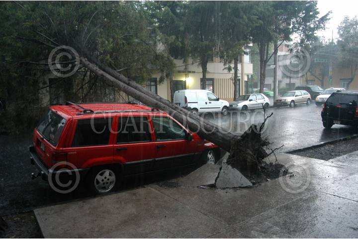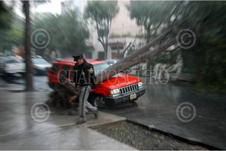 MÉXICO D.F. 10JULIO2007.-Las fuertes lluvias, probocaron la caida de un árbol sobre un auto en las calles de Atlixco y Juan Escutia en la colonia Condesa. FOTO: GUILLERMO PEREA/CUARTOSCURO.COM