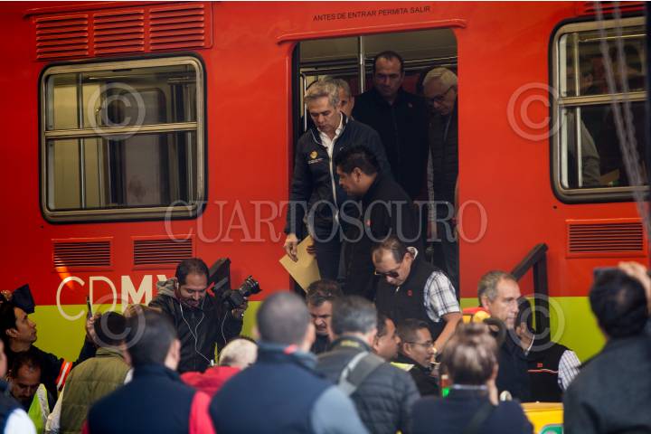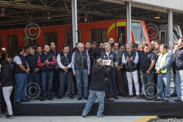 CIUDAD DE MÉXICO, 02DICIEMBRE2017.- Miguel Ángel Mancera Espinosa, jefe de gobierno, y Jorge Gaviño, titular del Transporte Colectivo Metro, encabezaron la entrega de 9 trenes restaurados para el metro de la capital. FOTO: TERCERO DÍAZ /CUARTOSCURO.COM