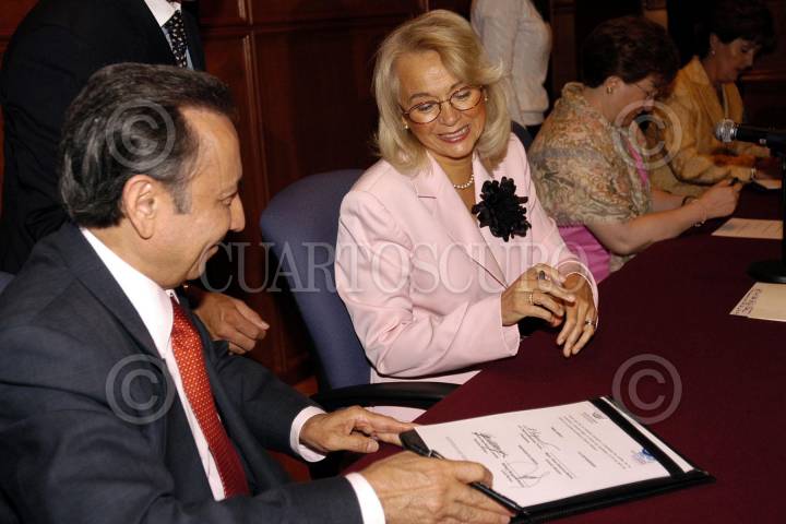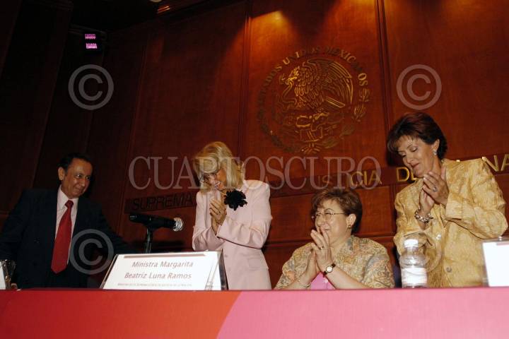 MEXICO, D.F., 245ABRIl2006.- El magistrado Cesar Esquinca, las ministras Olga Ma. Sánchez Cordero, Margarita Beatriz Luna Ramos y Patricia Espinosa, directora del INM, durante la firma de Convenio de colaboración entre el Instituto Nacional de Mujeres y el Instituto Federal de Defensoría Pública, realizada en la Suprema Corte de Justicia de la Nación. FOTO: SCJN/CUARTOSCURO.COM