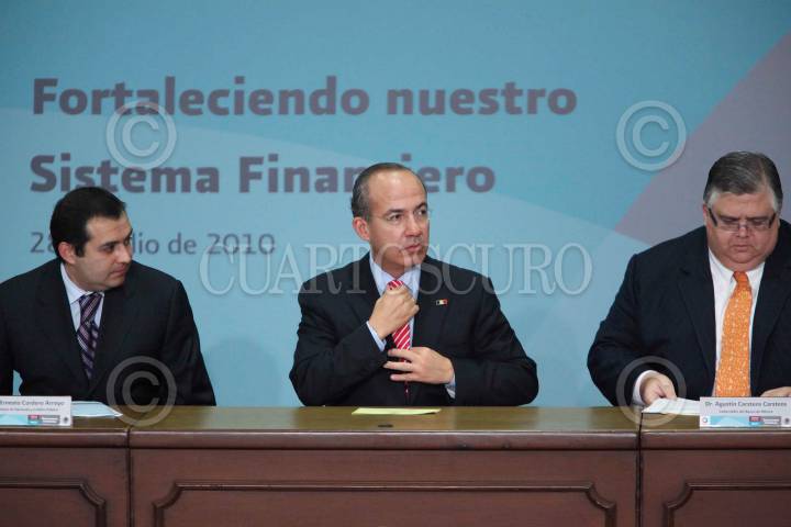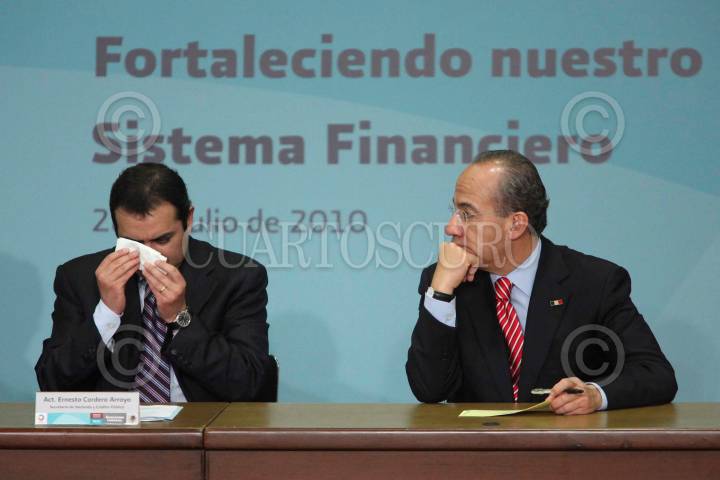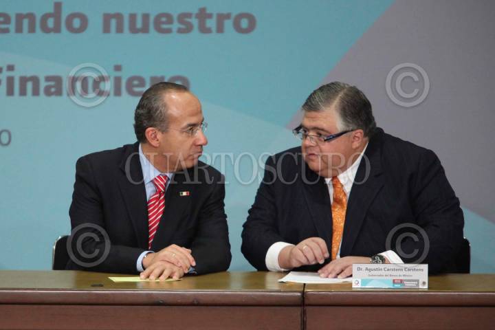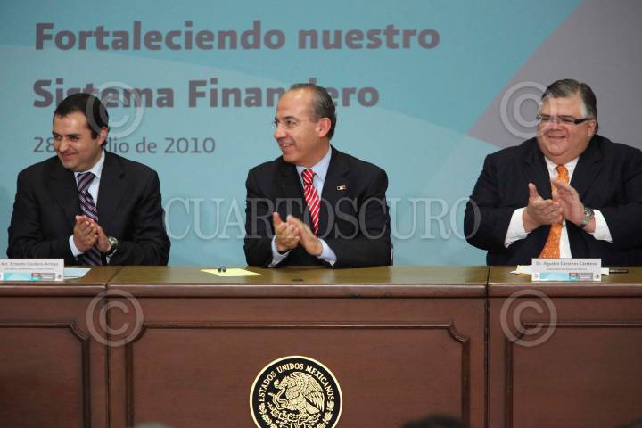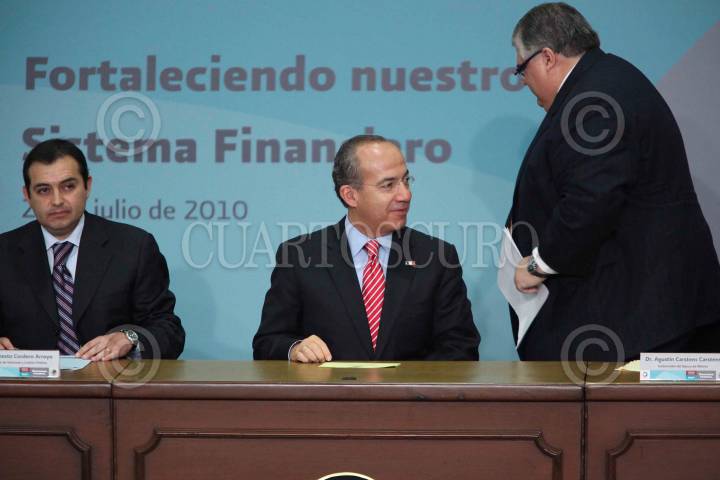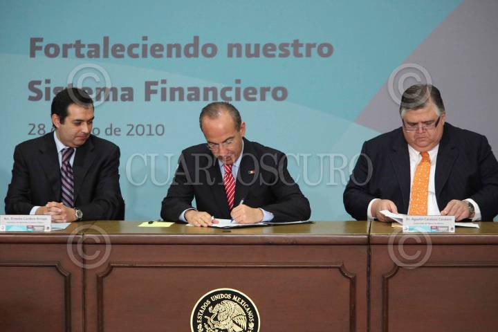 MÉXICO, D.F., 28JULIO2010.- Felipe Calderón Hinojosa, Presidente de México, acompañado y Agustín Cartens Cartens, Gobernador del Banco de México, durante la firma del decreto para la creación del Consejo de Estabilidad del Sistema Financiero, esto en la residencia oficial de los Pinos. FOTO: GUILLERMO PEREA/CUARTOSCURO.COM