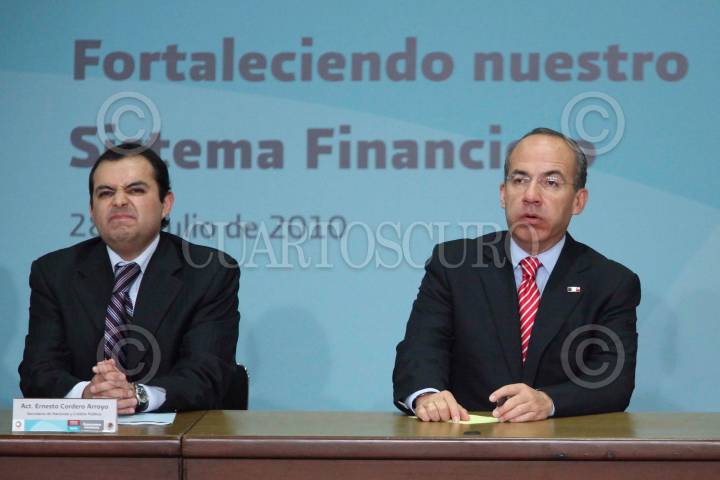 MÉXICO, D.F., 28JULIO2010.- Felipe Calderón Hinojosa, Presidente de México, acompañado de Ernesto Cordero, Secretario de Economía, encabezo la firma del decreto para la creación del Consejo de Estabilidad del Sistema Financiero, esto en la residencia oficial de los Pinos. FOTO: GUILLERMO PEREA/CUARTOSCURO.COM