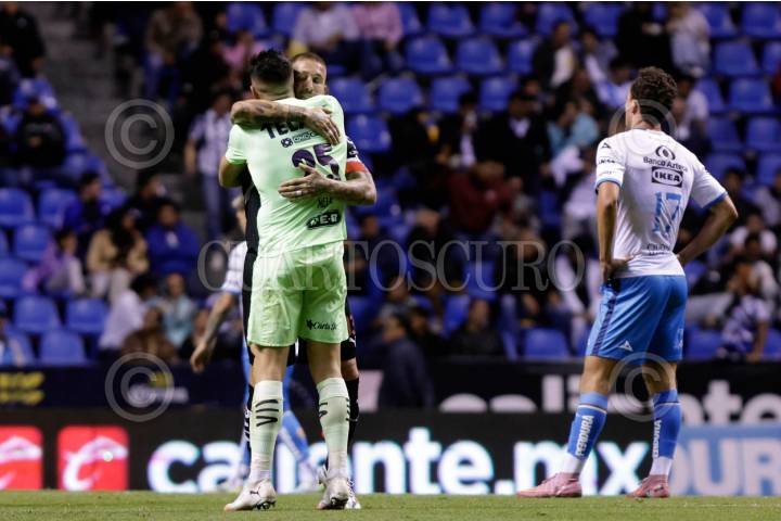 PUEBLA, PUEBLA, 29AGOSTO2025.- Owen González y Gerardo Arteaga durante el partido entre el Club Puebla y los rayados de Monterrey, correspondiente a la jornada 7 del torneo Apertura 2025 de la Liga BBVA MX, celebrado en el Estadio Cuauhtémoc. FOTO:MIREYA NOVO/CUARTOSCURO.COM
