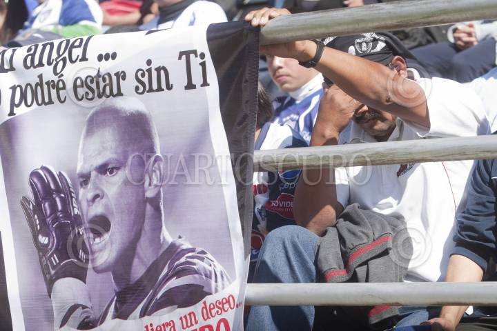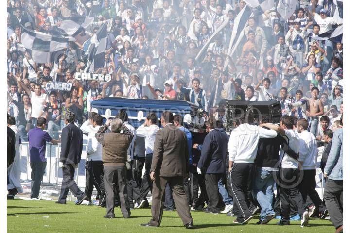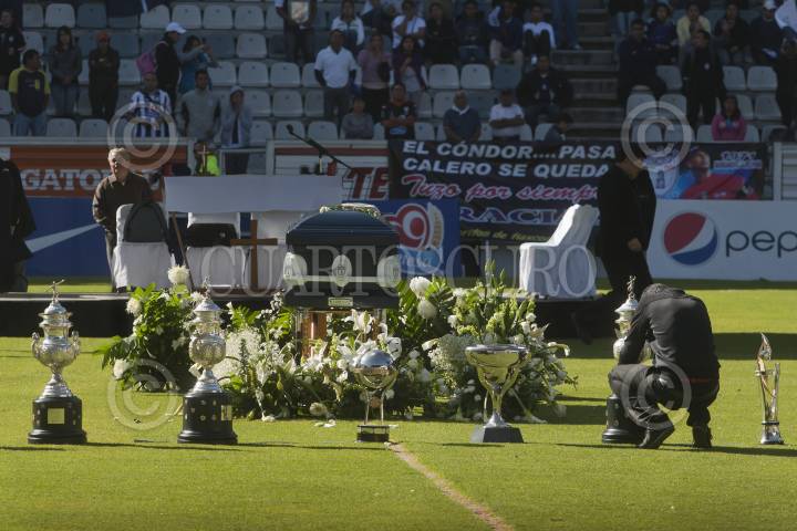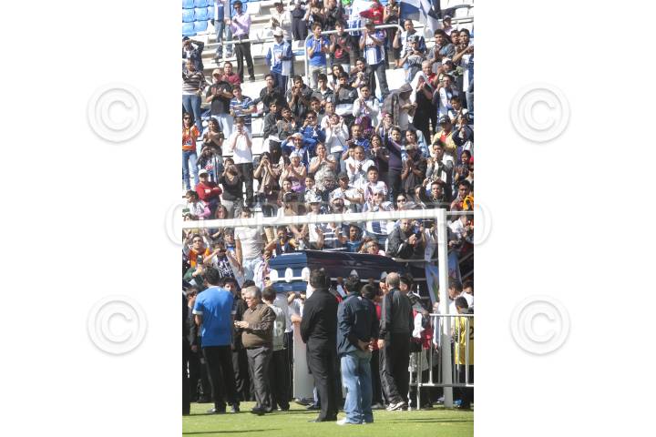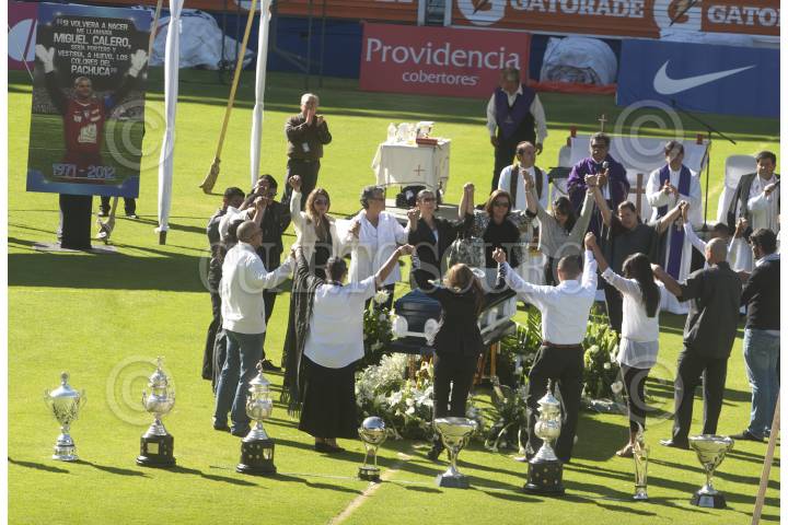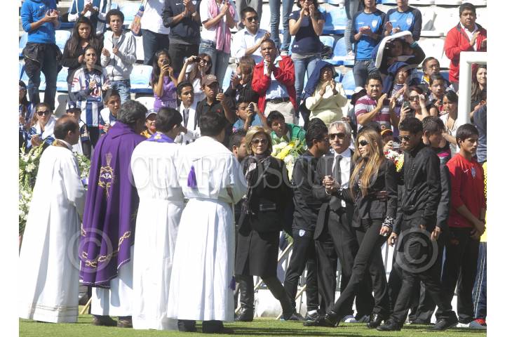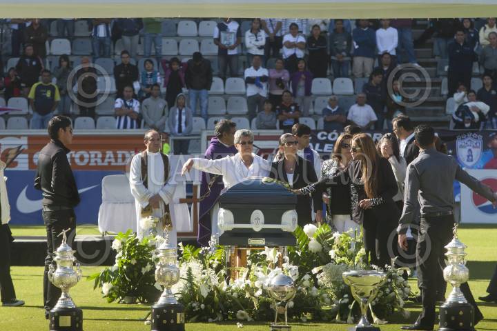 PACHUCA, HIDALGO, 05DICIEMBRE2012.- El cuerpo del portero Miguel Calero, integrante de los "Tuzos de Pachuca" fue homenajeado con una misa en el Estadio Miguel Hidalgo. El arquero de origen colombiano murió hace dos días de un infarto cerebral. Afición, jugadores, familiares, amigos y directivos del Club Pachuca despidieron a su ídolo. En la ceremonia religiosa estuvo presente su esposa Sandra Sierra, su hijo Juan José Calero y el hermano Miltón Calero, y el presidente del club Jesús Martínez, quienes recibieron las condolencias de los presentes. FOTO: FRANCISCO RODRÍGUEZ / CUARTOSCURO.COM