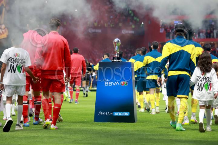 TOLUCA, ESTADO DE MÉXICO, 25MAYO2025. Los jugadores de Diablos y Águilas salen a la cancha previo al partido de fútbol Toluca vs América correspondiente a la final de vuelta del Torneo Clausura 2025 de Liga BBVA MX, en el Estadio Nemesio Díez. FOTO: EDGAR NEGRETE LIRA/CUARTOSCURO.COM