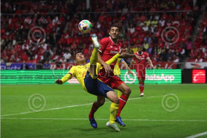 TOLUCA, ESTADO DE MÉXICO, 25MAYO2025. Andrés Pereira de los Diablos se adelanta a Alejandro Zendejas de las Águilas durante el partido de fútbol Toluca vs América correspondiente a la final de vuelta del Torneo Clausura 2025 de Liga BBVA MX, en el Estadio Nemesio Díez. FOTO: EDGAR NEGRETE LIRA/CUARTOSCURO.COM