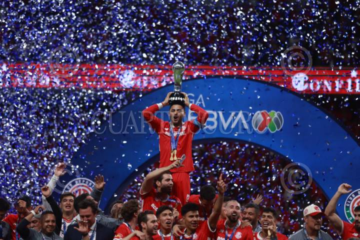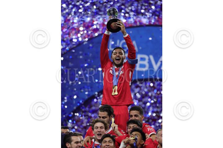 TOLUCA, ESTADO DE MÉXICO, 25MAYO2025. El capitán Alexis Vega levanta el trofeo de campeón durante la ceremonia en la que Toluca se corona en el Torneo Clausura 2025 de Liga BBVA MX, en el Estadio Nemesio Díez. FOTO: EDGAR NEGRETE LIRA/CUARTOSCURO.COM