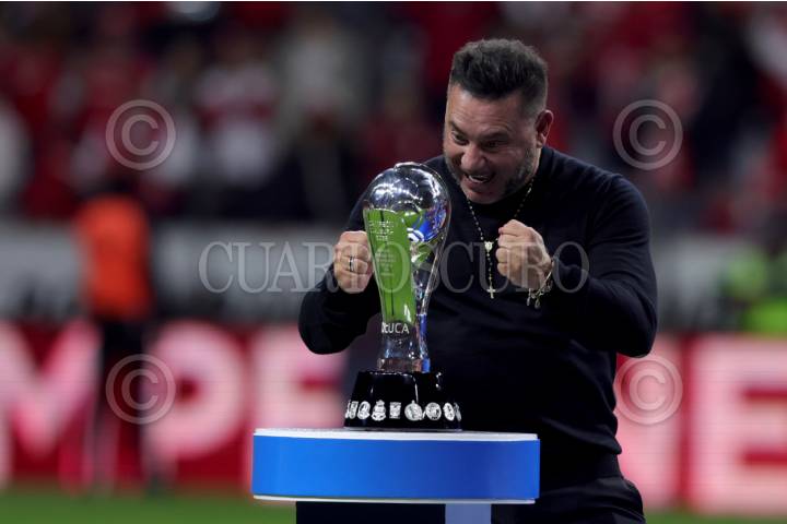 TOLUCA, ESTADO DE MÉXICO, 25MAYO2025. El DT Antonio Mohamed festeja junto al trofeo de campeón durante la premiación al equipo de Toluca quien se corona en el Torneo Clausura 2025 de Liga BBVA MX, en el Estadio Nemesio Díez. FOTO: EDGAR NEGRETE LIRA/CUARTOSCURO.COM