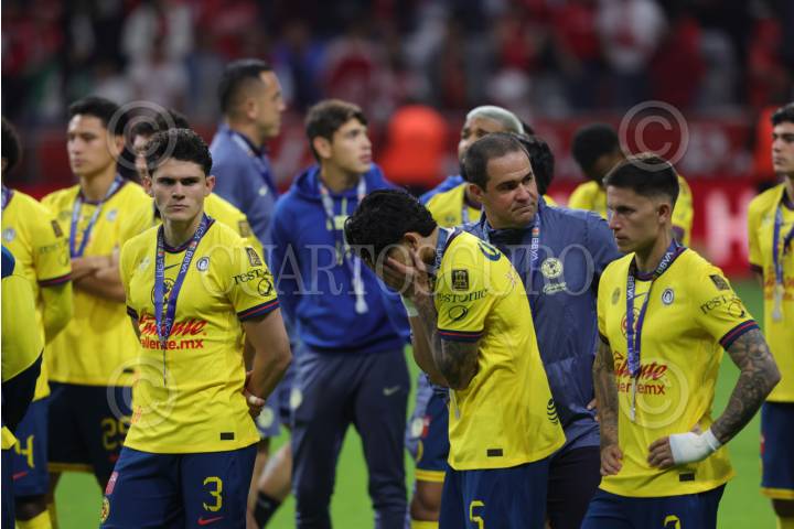 TOLUCA, ESTADO DE MÉXICO, 25MAYO2025. Jugadores del América abatidos tras perder la final ante Toluca quien se coronó campeón del Torneo Clausura 2025 de Liga BBVA MX, en el Estadio Nemesio Díez. FOTO: EDGAR NEGRETE LIRA/CUARTOSCURO.COM
