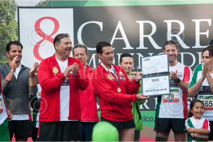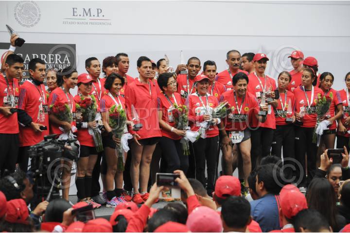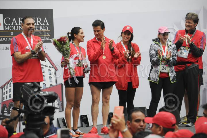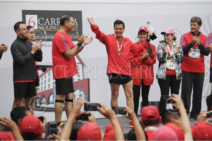 CIUDAD DE MÉXICO, 16JULIO2016.- Enrique Peña Nieto, presidente de México, su hija Paulina Peña Pretelini; Roberto Francisco Miranda Moreno, jefe del estado mayor presidencial; Xóchitl Gálvez, delegada en Miguel Hidalgo; Claudia Ruiz Massieu, secretaria de Relaciones Exteriores: Andrés Massieu Fernández, coordinador general de Política y Gobierno de la Presidencia de la República; Francisco Guzmán Ortiz, jefe de la oficina de la Presidencia de la República, entre otros, encabezaron la sexta edición de la carrera Molino del Rey, organizada por el estado mayor en el bosque de Chapultepec y los Pinos. Al finalizar el Jefe de Ejecutivo entregó los premios a los ganadores. FOTO: DIEGO SIMÓN SÁNCHEZ /CUARTOSCURO.COM