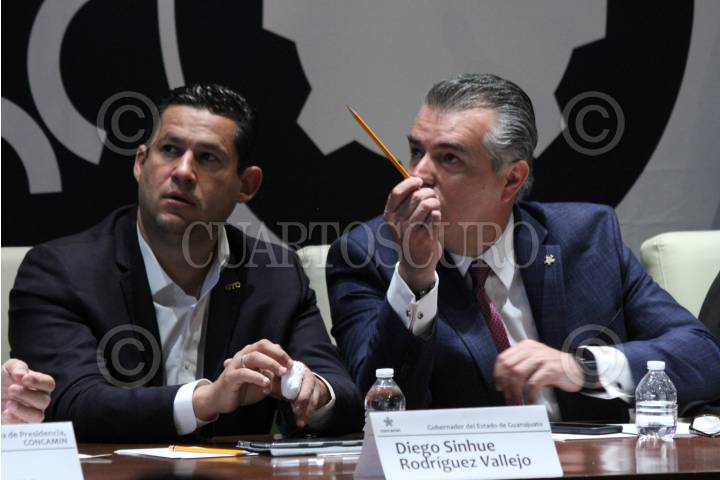 CIUDAD DE MÉXICO, 25ABRIL2019.- Diego Sinhue Rodríguez Vallejo, Gobernador de Guanajuato y Francisco Cervantes Díaz, Presidente Concamin, durante la Conferencia de prensa para anunciar la Reunión Anual de Industriales 2019 (RAI) y la Feria Industrial de Hannover en la cual esperan a poco más de 12 mil visitantes en el estado de Guanajuato. FOTO: ROGELIO MORALES /CUARTOSCURO.COM