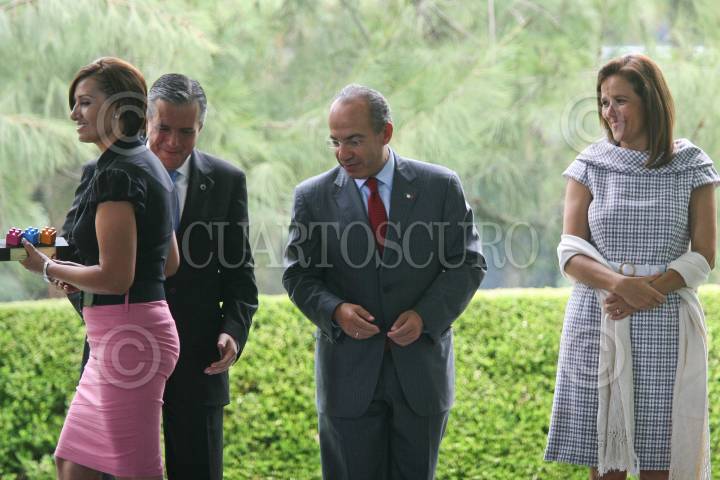 MÉXICO, D.F., 25JULIO2011.- Margarita Zavala, presidenta del DIF-Nacional; Yessika Tovar Díaz (madre beneficiada); Felipe Calderón Hinojosa, presidente de México y Heriberto Félix Guerra, secretario de Desarrollo Social durante la entrega del reconocimiento "800 mil niños beneficiados" en las estancias infantiles. Ésto se realizó en la residencia oficial de Los Pinos. FOTO: MISAEL VALTIERRA/CUARTOSCURO.COM