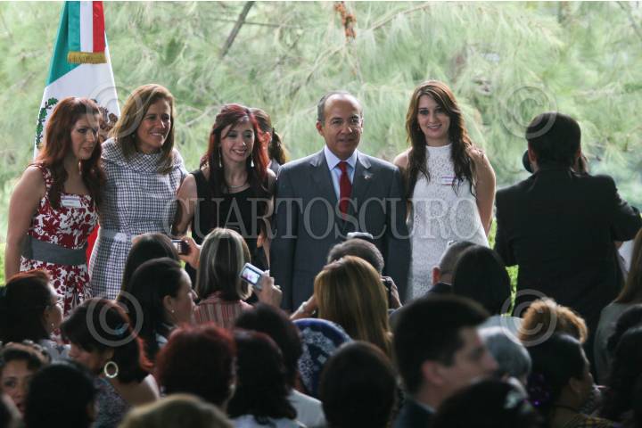 MÉXICO, D.F., 12MAYO2011.- Margarita Zavala de Calderón y Felipe Calderón Hinojosa, presidente de México, se tomaron fotos con las encargadas de estancias infantiles en el país, durante la ceremonia de entrega de reconocimientos en la residencia oficial de Los Pinos. FOTO: ISAAC ESQUIVEL/CUARTOSCURO.COM