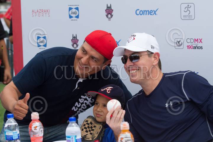 MÉXICO, D.F., 13JUNIO2015.- Con la presencia de Esteban Loaiza e Ismael "Rocket" Valdez se realizó el juego de las estrellas en el diamante instalado en el Zócalo en donde se celebra el Home Run Derby. También estuvo presente Horacio de la Vega, secretario del Deporte del DF y el asambleísta Manuel Granados. FOTO: LMB /CUARTOSCURO.COM