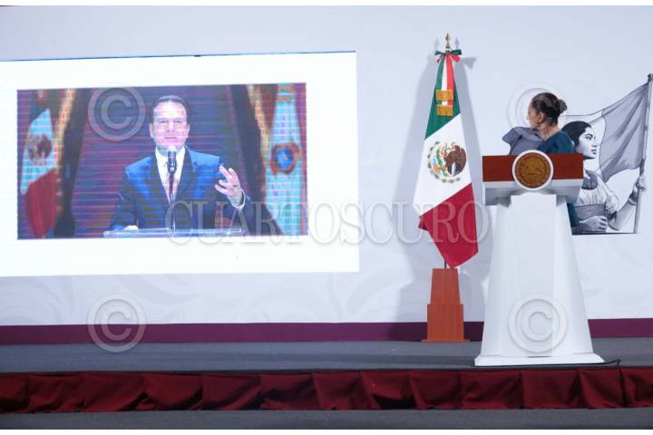 CIUDAD DE MÉXICO, 20MARZO2025.- Esteban Villegas Villareal, gobernador de Durango, sostuvo un enlace en vivo con Claudia Sheinbaum, presidenta de los Estados Unidos Mexicanos, durante la Mañanera del Pueblo realizada en Palacio Nacional. FOTO: GRACIELA LÓPEZ/CUARTOSCURO.COM