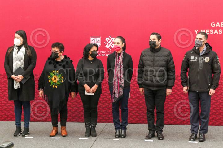 Estefany Correa García, Ernestina Godoy, Margarita Saldaña, Claudia Sheinbaum, Martí Batres, y Omar García Harfuch, durante la instalación del Gabinete de Seguridad y la Mesa de Construcción de Paz en la Alcaldía Azcapotzalco