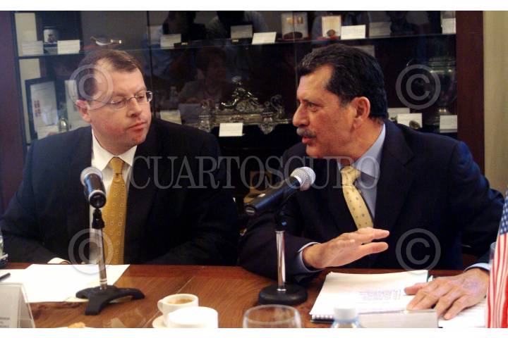 México D.F 15 Abril 2004.- Armand Perschard, director del Centro de Estudios Estrategicos Internacionales de Estados Unidos y Enrique Jackson presidente de la Mesa directiva del Senado, durante la reunión con los senadores. FOTO: Eunice Adorno/CUARTOSCURO.COM