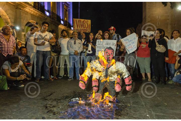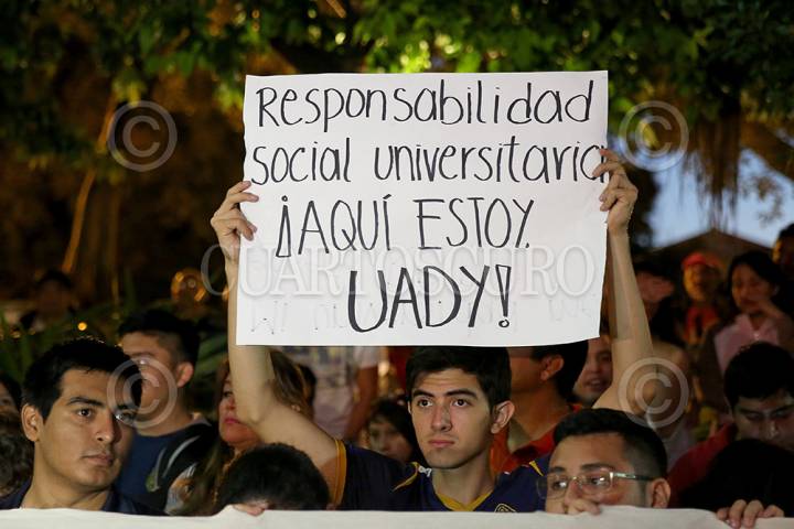 MÉRIDA, YUCATÁN, 26ENERO2015.- Estudiantes universitarios participaron en la protesta convocada por el Frente Estudiantil UADY para exigir sus derechos y piden se acabe la huelga de Universidad Autónoma de Yucatán, además mostraron solidaridad con el caso Ayotzinapa. FOTO: FRANCISCO BALDERAS /CUARTOSCURO.COM