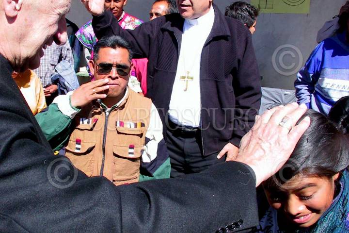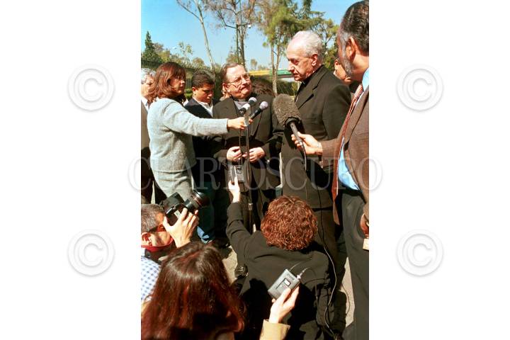 El Cardenal Roger Etchegaray (izquierda), de Francia, y el Obispo de San Cristóbal de las Casas, Felipe Arizmendi Ezquivel (centro). Etchegaray fue mandado a Chiapas por el Papa con el objetivo de manifestar su interes en este estado y dar su apoyo a la busqueda de la justicia y la paz. Foto: Nell Farrell/CURTOSCURO.COM