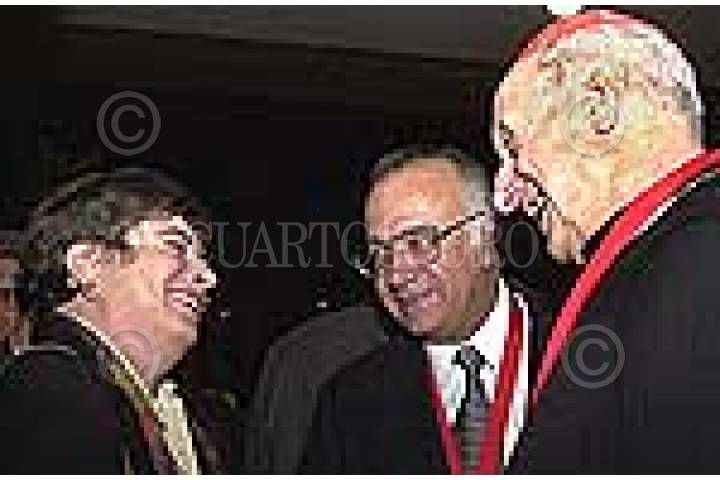 Marie Claire Acosta felicita al representante papal Roger Etchegaray, quien recibió esta tarde el Doctorado Honoris Causa por la Universidad Iberoamericana. Al centro el rector de esa casa de estudios FOTO: Juan Pablo Zamora/CUARTOSCURO.COM