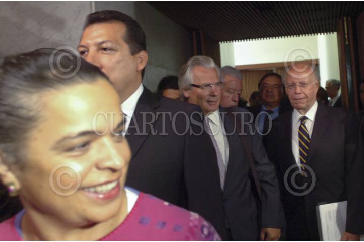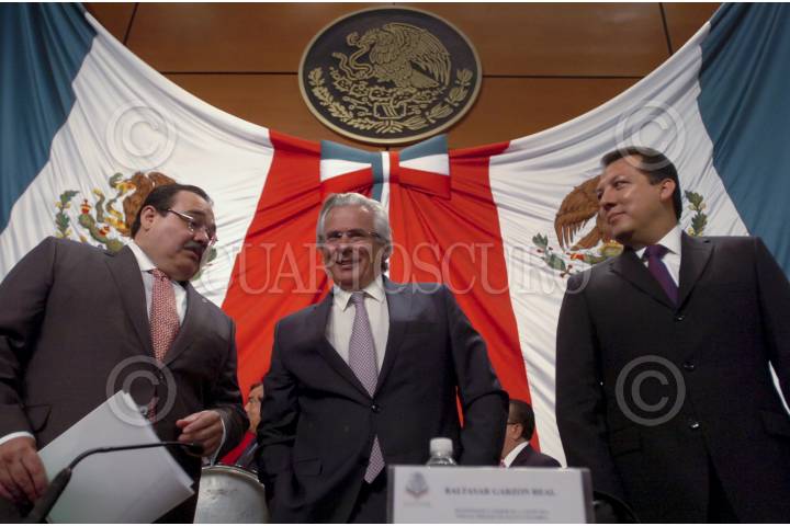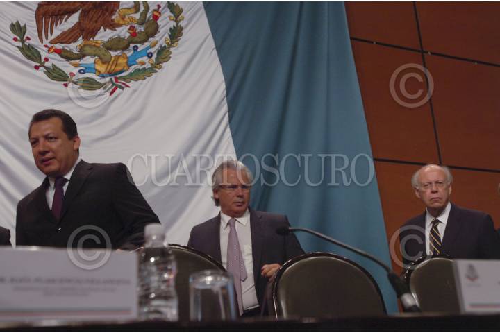 MÉXICO, D.F., 29agosto2011.- José Narro Robles, Rector de la UNAM, Baltasar Garzón Real, Magistrado especialista en temas sobre terrorismo y crimen organizado, Raúl Plascencia Villanueva · Presidente de la Comisión Nacional de los Derechos Humanos y Carlos Ramírez Marin, Diputado del PRI y presidente de la mesa directiva de la Cámara de Diputados, durante la inauguración del foro “Legalidad Democrática , Ética, Derechos Humanos y Seguridad” que se realizó en El Palacio Legislativo de San Lázaro. FOTO: GUILLERMO PEREA/CUARTOSCURO.COM