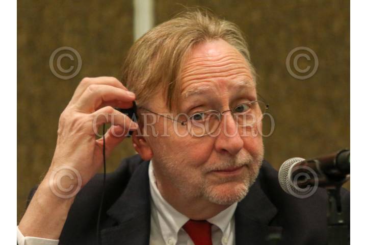 Representantes del Parlamento Europeo en el tema comercial en rueda de prensa.