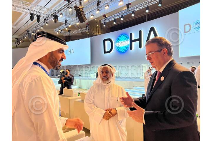 Jeque Mohammed bin Abdulrahman Al-Thani, ministro de Asuntos Exteriores de Qatar y Marcelo Ebrard recorrieron el estadio de fútbol Ahmed bin Ali conocido como el "estadio Mexicano"-