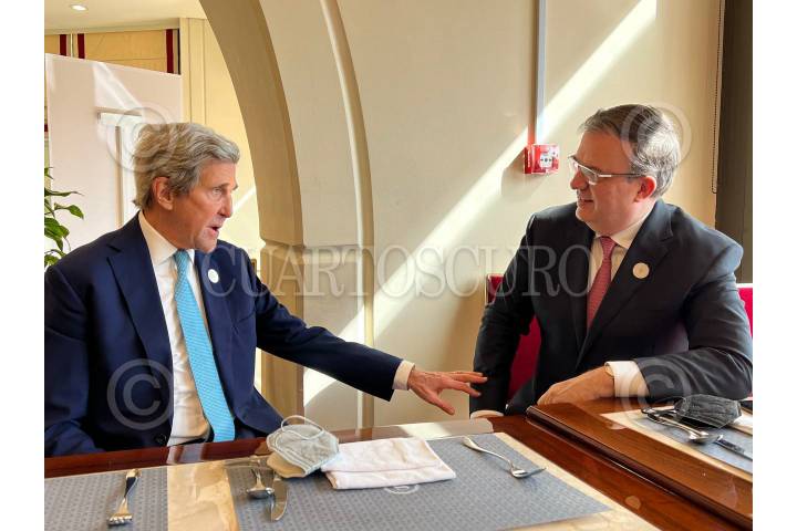 John Kerry, enviado especial para el clima de Estados Unidos, y Marcelo Ebrard durante el Doha Forum 2022.