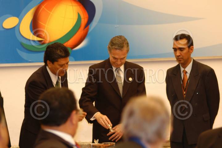 GUADALAJARA, JALISCO 27MAYO2004.- El secretario de Relaciones Exteriores, Luis Ernesto Derbez, realizo la cancelación del timbre postal conmemorativo de la Tercera Cumbre America Latinay el Caribe-Unión Europea. FOTO: Germán Romero/CUARTOSCURO.COM