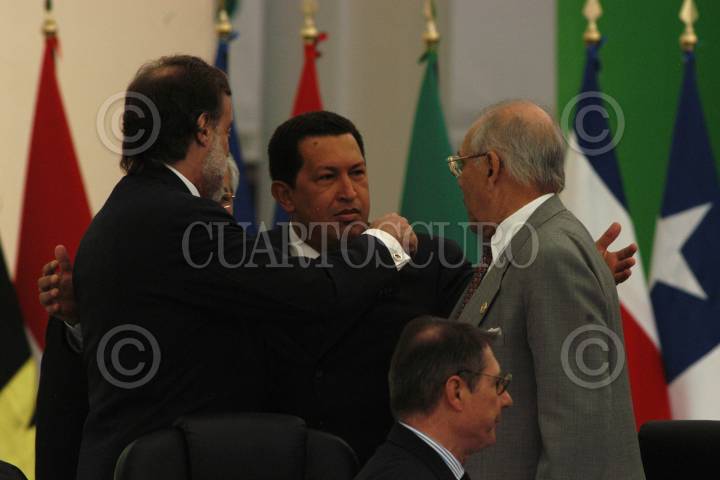 GUADALAJARA, JALISCO 28MAYO2004.- El presidente de Venezuela, Hugo Chavez, es saludo antes de la inauguración de la Tercera Cumbre América Latina y el Caribe-Unión Europea. FOTO: Germán Romero/CUARTOSCURO.COM