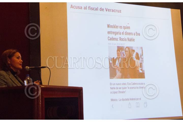 CIUDAD DE MÉXICO, 31MAYO2017.- Eva Cadena, diputada local de Veracruz por el partido Morena, ofreció una conferencia de prensa donde argumentó su inocencia en los videos que se mostraron hace unas semanas donde se ve a la diputada recibiendo 500 mil pesos, supuestamente para entregar a Andrés Manuel López Obrador. FOTO: TERCERO DÍAZ /CUARTOSCURO.COM
