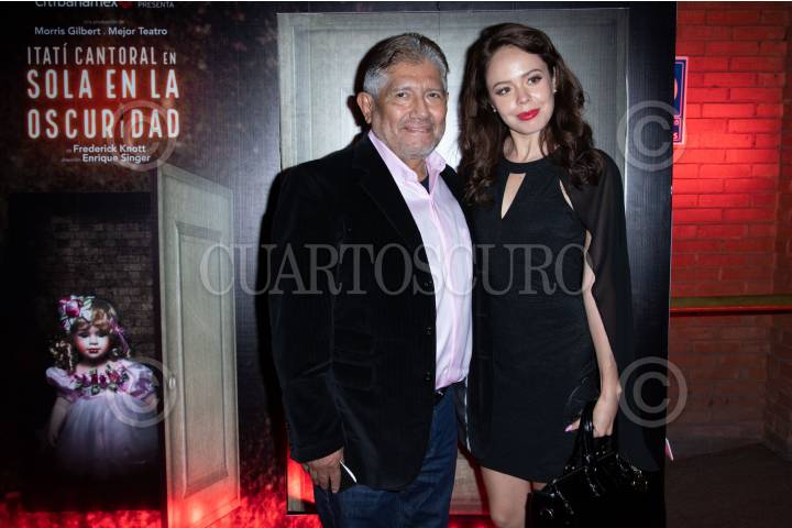 El productor Juan Osorio y su novia Eva Daniela a su paso por la alfombra roja por las primeras 100 representaciones de la puesta en escena "Sola en la oscuridad", que se presenta en el Teatro México del Centro Teatral Manolo Fábregas.