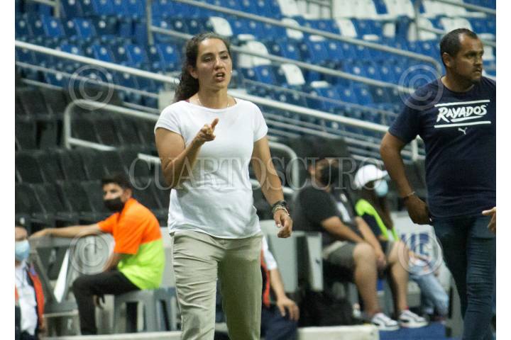 Eva Espejo, entrenadora del equipo de las Rayadas del Monterrey, durante el encuentro ante el equipo de Tigres Femenil en el estadio BBVA, partido correspondiente a la ida de la final de la Liga Femenil, Apertura 2021. Marcador Final: Rayadas: 2 - Tigres Femenil: 2