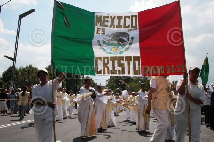 MÉXICO D.F. 07ABRIL2007.-Integrantes de diversas congregaciones Evangélicas, portan una bandera nacional con la leyenda "México es de Cristo salmo 33:12" esto al realizar una caminata en avenida Paseo de la Reforma que comenzo del Museo de Antropología e Historia al Zócalo capitalino. FOTO: JEFTÉ ARGUELLO/CUARTOSCURO.COM