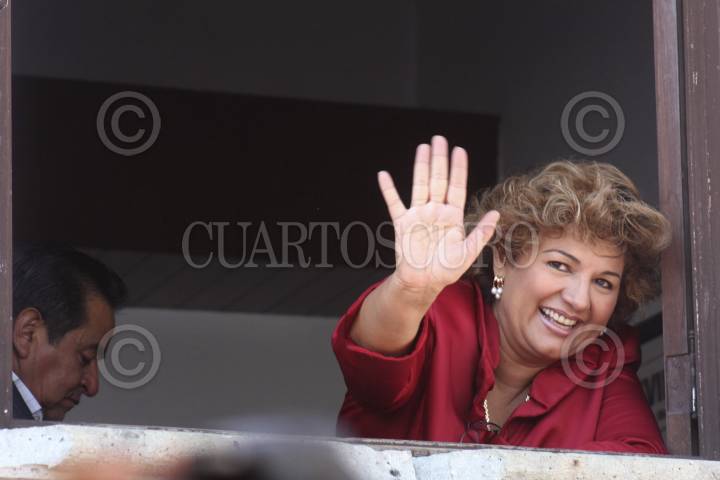 OAXACA, OAXACA, 21ENERO2012.- Carmelita Ricárdez Vela, secretaria General del PRI Oaxaca acompañada de Arturo Osornio Sánchez delegado del PRI en la entidad observan desde una ventana el registro de los diputados federales Eviel Pérez Magaña y Sofía Castro Ríos precandidatos al Senado. FOTO: ARTURO PEREZ ALFONSO/CUARTOSCURO.COM
