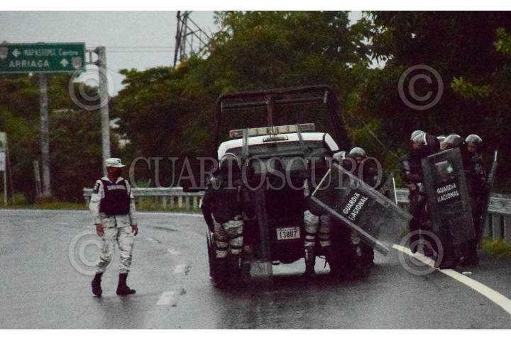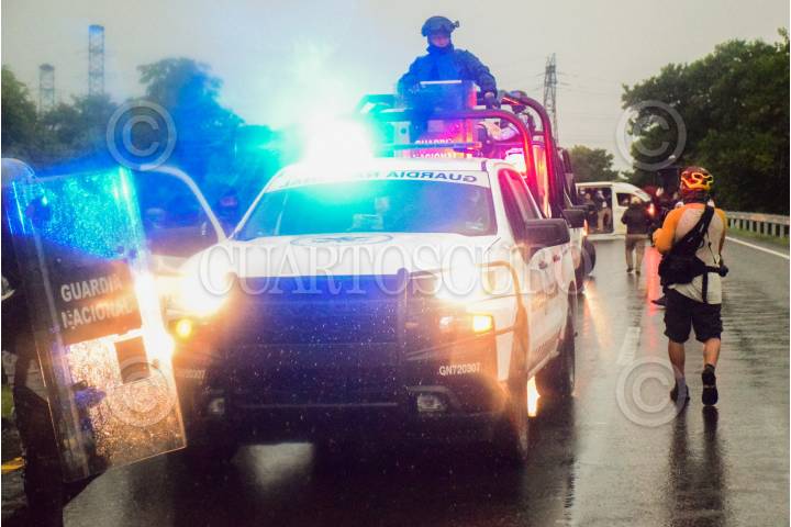 El segundo bloque de la caravana migrante pasa caminando una subestación de la Guardia Nacional.