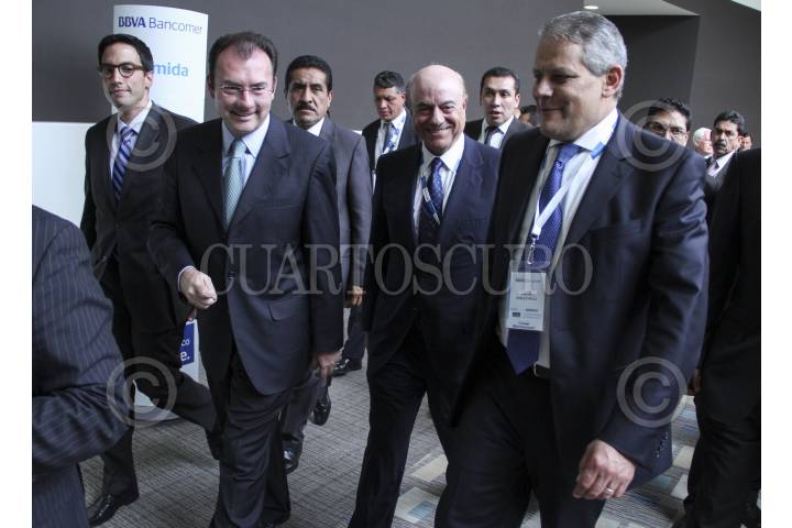 MÉXICO, D.F., 28MAYO2013.- Luis Videgaray, Secretario de Hacienda y Crédito Público; Francisco González Rodríguez, Presidente del Grupo BBVA; y Luis Robles Miaja, Presidente del Consejo de Administración de BBVA Bancomer; a su salida de la Reunión Nacional de Consejeros BBVA Bancomer 2013. FOTO: ADOLFO VALTIERRA /CUARTOSCURO.COM