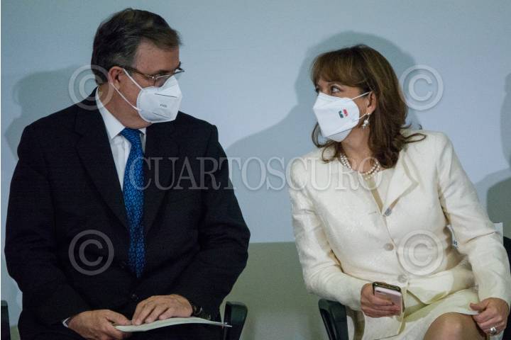 Marcelo Ebrard y Martha Delgado Peralta durante la presentación del Pabellón de México para la expo Dubai 2020 en la Secretaría de Relaciones Exteriores (SRE).