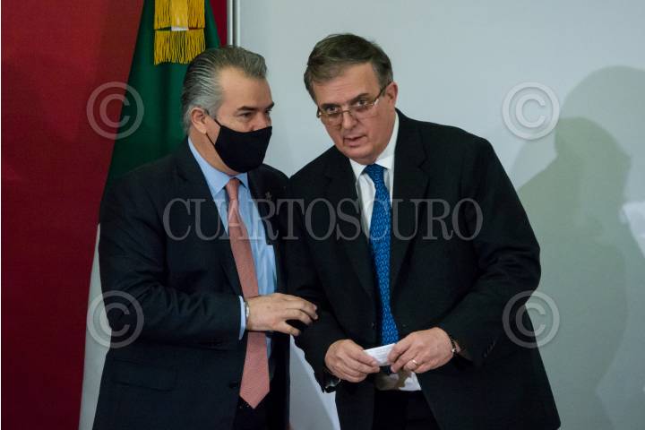 Francisco Cervantes Díaz y Marcelo Ebrard durante la presentación del Pabellón de México para la expo Dubai 2020 en la Secretaría de Relaciones Exteriores (SRE).