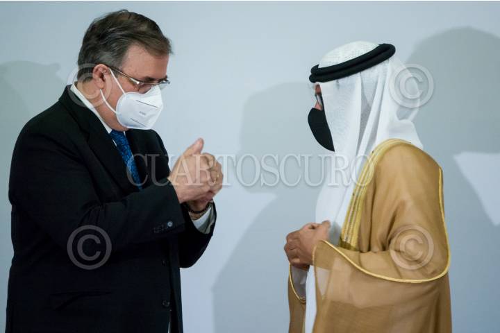 Marcelo Ebrard y Ahmed Almenhal durante la presentación del Pabellón de México para la expo Dubai 2020 en la Secretaría de Relaciones Exteriores (SRE). durante la presentación del Pabellón de México para la expo Dubai 2020 en la Secretaría de Re