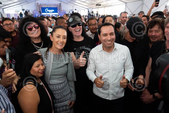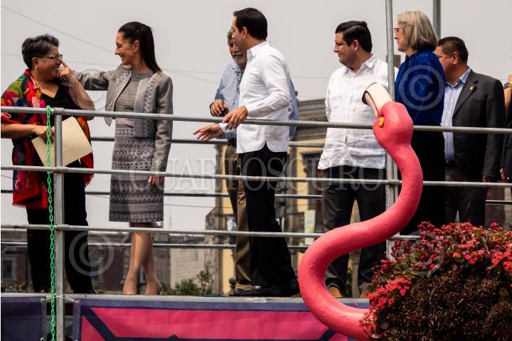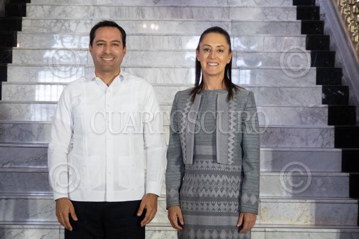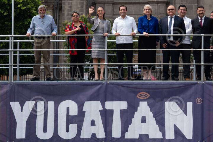Claudia Sheinbaum y Mauricio Vila durante la inauguración de Yucatán Expone, muestras que reúne a más de 100 expositores del estado en el Zócalo capitalino.