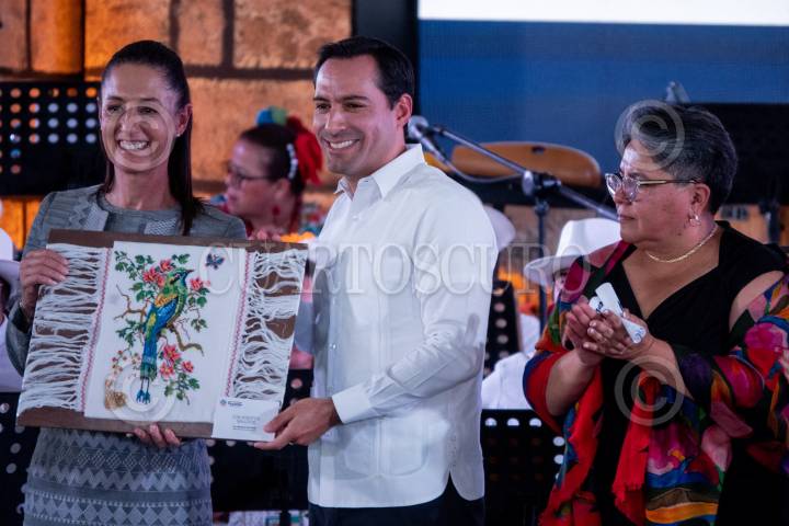 Raquel Buenrostro. Claudia Sheinbaum y Mauricio Vila durante la inauguración de Yucatán Expone, muestras que reúne a más de 100 expositores del estado en el Zócalo capitalino.