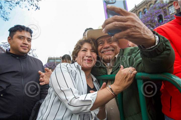 Simpatizantes del Presidente de México, Andrés López Obrador y de la 4T se dieron cita en el Zócalo para conmemorar el 85 Aniversario de la Expropiación Petrolera. En la imagen la candidata al Edomex, Delfina Gómez.